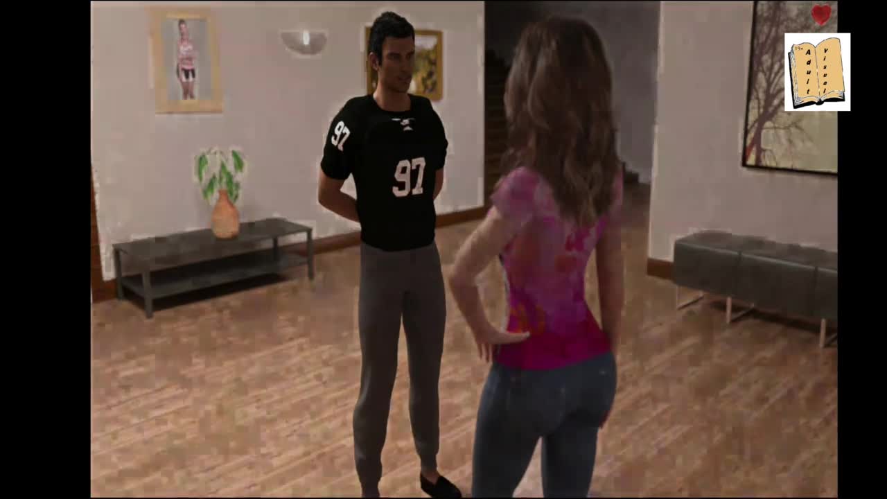 A wife and stepmother share kisses in a 3d game.